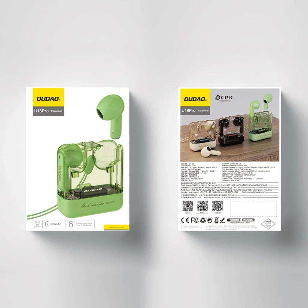 Fedezze fel a kiváló hangzás új dimenzióját a Dudao U18Pro-val - Bluetooth fülhallgatókkal, amelyek különleges dizájnjukkal fognak meglepni. A legújabb Bluetooth 5.3 technológia és a nagy kapacitású akkumulátor használata mobilitást és funkcionalitást biztosít. Fedezze fel, miért a Dudao U18Pro a tökéletes választás az igényes felhasználók számára. A Dudao U18Pro legfontosabb előnyei: - Kristálytiszta dizájn: A fülhallgatók átlátszó burkolata nemcsak modern megjelenést kölcsönöz, de bármilyen stílushoz is illeszkedik. Ezek többek, mint egyszerű fülhallgatók - divatos kiegészítője a mindennapi öltözékének. - LED megvilágított logó: Nemcsak fülhallgatók, hanem szemet gyönyörködtető kiegészítő is. A LED-megvilágított logó egyedi karaktert ad, így kiemelkedhet a tömegből. - Elegáns prémium csomagolás: A Dudao U18Pro-val nemcsak kiváló fülhallgatókat, hanem elegáns csomagolást is kap, ami hangsúlyozza egyedi jellegüket. Tökéletes ajándék önmagának vagy szeretteinek. Műszaki adatok: - Márka: Dudao - Modell: U18Pro - Szín: Zöld - Akkumulátor kapacitás: - fülhallgató: 33 mAh - tok: 300 mAh - Működési idő: akár 5 óra - Készenléti idő: akár 30 óra - Töltési idő: kb. 1,5 óra - Bluetooth verzió: 5.3 - Hatótáv: legfeljebb 10 m - Csatlakozó típusa: USB-C Kristálytiszta dizájn: A Dudao U18Pro-val stílusosan merülhet el a hangok világában. Az átlátszó kialakítás nemcsak lenyűgözően néz ki, hanem lehetőséget nyújt a fejlett technológiák megtekintésére, amelyeket ezek a fülhallgatók használnak. Nem csupán egy audió eszköz, hanem egy műalkotás, amely magára vonja a figyelmet. LED világítású logó: Tűnjön ki a tömegből egy LED-megvilágított logóval. Ez nemcsak egy elegáns részlet, hanem praktikus funkció is, amely információt nyújt a fülhallgatók állapotáról. A stílus és funkcionalitás itt kéz a kézben jár, így a Dudao U18Pro nemcsak fülhallgató, hanem az egyéni stílus kifejezése is. Elegáns prémium csomagolás: A Dudao U18Pro-val nemcsak kiváló fülhallgatókat, hanem elegáns csomagolást is kap, ami hangsúlyozza egyedi jellegüket. Ez a tökéletes megoldás, ha ajándékot keres önmagának vagy szeretteinek. Nyissa ki a csomagot, és érezze, hogyan vezeti be a luxus és a tökéletesség a tökéletes hangzás világába. Kényelmes és ergonomikus illeszkedés: Akár útközben, akár edzés közben hallgat zenét, a Dudao U18Pro tökéletes illeszkedést biztosít. Ergonomikus kialakítása kényelmessé teszi a viselést, és az átlátszó burkolat könnyedséget és stílust kölcsönöz.