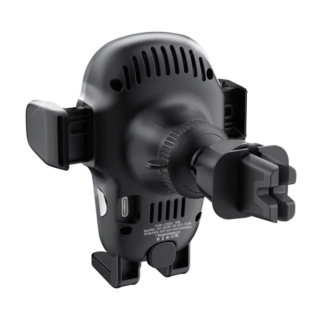 Univerzális autós telefontartó, szellőző lamellára helyezhetőABS + PC + Szilikon anyaghasználattalKimeneti teljesítmény: 5W / 7.5W / 10W / 15WMéret: 131 x 77 x 114mmVezeték nélküli Qi töltővel, 15W teljesítménnyelMicro USB bemenettel a töltés használatáhozBiztonságos rögzülést nyújtSúly: 141g