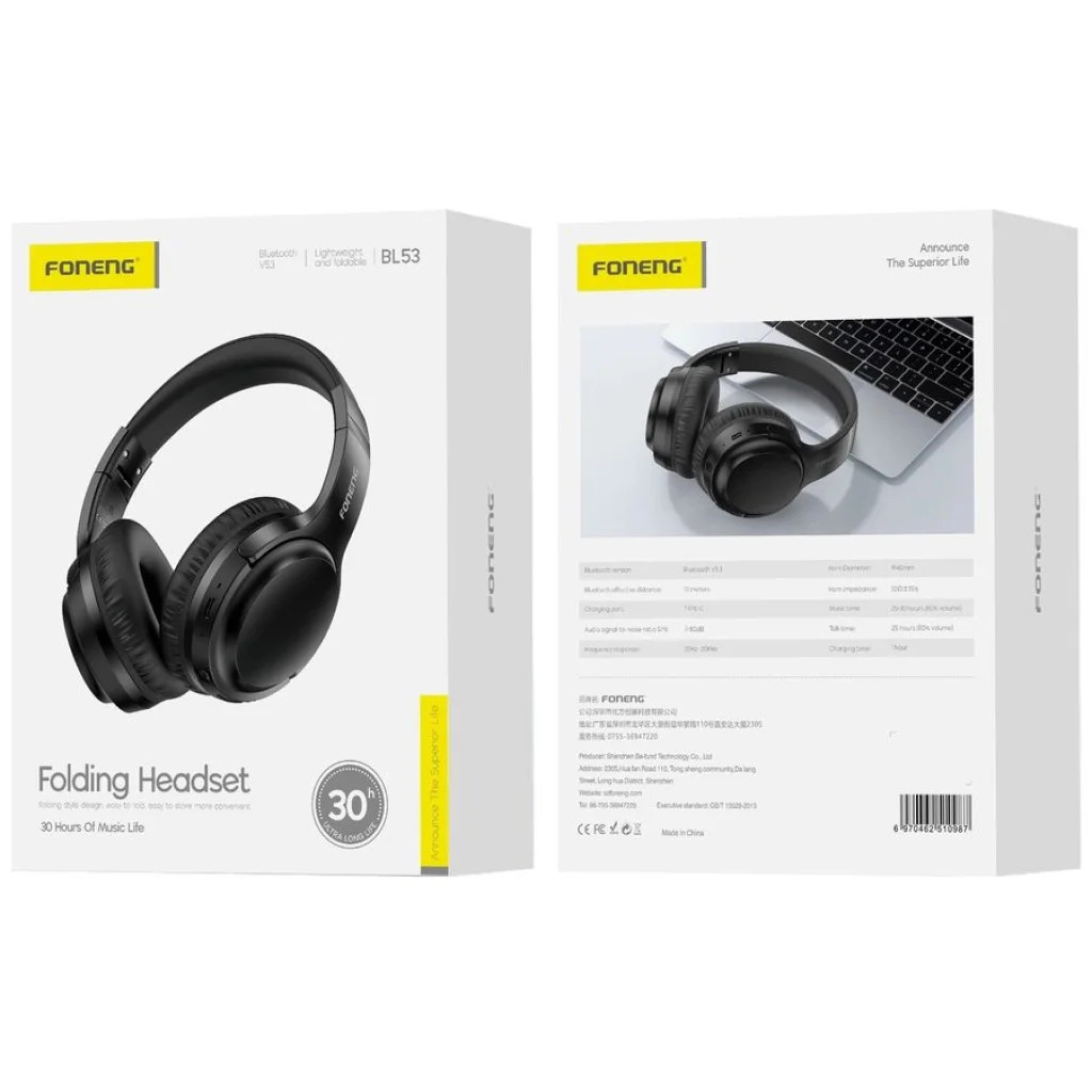 Foneng vezeték nélküli fejhallgató BL53 fekete Élvezze a zene szabadságát a Foneng BL53 vezeték nélküli fejhallgatóval, amely kiváló hangminőséget, kényelmet és hosszan tartó akkumulátor-üzemidőt kínál. Ez a stílusos, fekete színű fejhallgató ideális választás mindazok számára, akik megbízható és hordozható audioélményt keresnek a mindennapokra. Főbb jellemzők Bluetooth 5.3 technológia: A legújabb Bluetooth V5.3 verzió stabil és gyors vezeték nélküli kapcsolatot biztosít, akár 10 méteres hatótávolságig, minimalizálva a késleltetést. Hosszan tartó akkumulátor élettartam: Élvezze a zenét akár 30 órán keresztül egyetlen feltöltéssel (80%-os hangerőn 25 óra), és beszélgessen akár 20 órán keresztül. Felejtse el a gyakori töltést! Gyors töltés: A modern USB Type-C töltőportnak köszönhetően mindössze 1 óra alatt teljesen feltölthető. Összecsukható és könnyű design: A "Folding Headset" kialakításnak köszönhetően a fejhallgató rendkívül kompakt módon összecsukható, így könnyedén tárolható és szállítható, ideális utazáshoz vagy mindennapi ingázáshoz. Kiváló hangminőség: A 40 mm-es hangszórók tiszta és dinamikus hangzást biztosítanak a 20Hz-20KHz frekvencia átviteli tartományban, ≥70dB jel-zaj aránnyal. Merüljön el kedvenc zenéiben részletgazdag hangzással. Kényelmes viselet: Az ergonomikus kialakítású fülpárnák és állítható fejpánt hosszan tartó, kényelmes viselést garantálnak, még órákon át tartó használat esetén is. Műszaki adatok Márka: FONENG Modell: BL53 Szín: Fekete Bluetooth verzió: V5.3 Bluetooth hatótávolság: 10 méter Töltőport: USB Type-C Hangszóró átmérő: 40 mm Hangszóró impedancia: 32Ω ± 15% Frekvencia átvitel: 20Hz - 20KHz Jel-zaj arány (SNR): ≥70dB Zenelejátszási idő: Akár 30 óra (80% hangerőn 25 óra) Beszélgetési idő: Akár 20 óra (80% hangerőn) Töltési idő: Kb. 1 óra Csomagolás: Bliszter