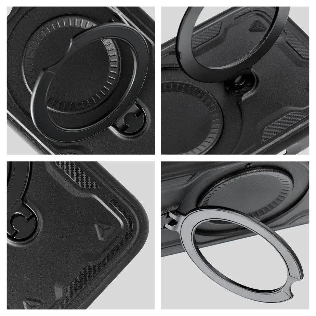 A megerősített szerkezetű és praktikus, kihúzható állvánnyal ellátott tok egy szilárd megoldás, amely tökéletesen működik a mindennapi használat során. A vezeték nélküli töltéssel való kompatibilitás és a kamera körüli megemelt szél mind komfortot, mind védelmet biztosít. A megerősített páncél típusú kialakítás hatékonyan védi a készüléket, és a kettős anyagszerkezet tovább növeli a tartósságot. Az oldalak puha TPU anyaga tökéletesen illeszkedik a telefonhoz, míg a kemény PC hátlap jobb védelmet nyújt a készülék hátuljának esés esetén. A tokba rejtett gyűrű stabil állványként működik, lehetővé téve, hogy a telefont kényelmesen vízszintes helyzetbe állítsd - kiváló megoldás filmek vagy fényképek nézésekor. Összecsukott állapotban a gyűrű beleolvad a tokba, anélkül hogy zavarná a töltést vagy a készülék használatát. A kamera körüli megemelt szél további védőgátat biztosít a lencséknek, lehetővé téve, hogy biztonságosan letehesd a telefont a lencsék karcolódásának veszélye nélkül. A tok támogatja a vezeték nélküli töltést, így anélkül töltheted és használhatod a mágneses tartókat, hogy eltávolítanád a tokot.