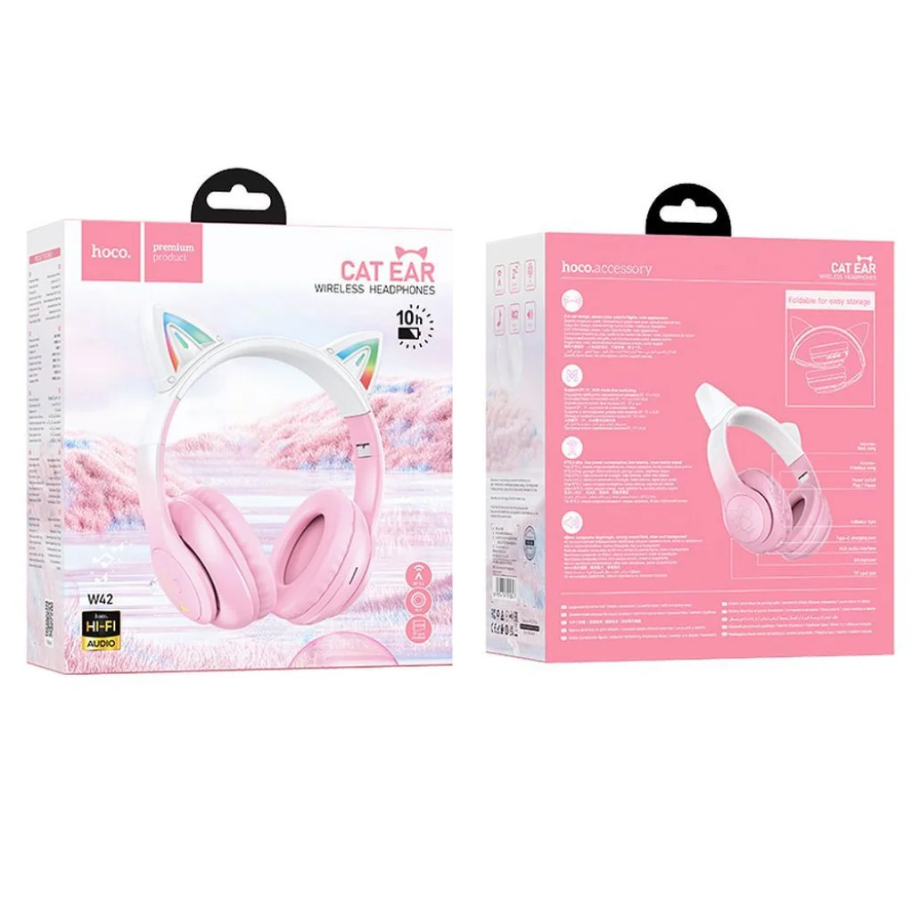 Vezeték nélküli Hoco W42 fejhallgató macskafülekkel. Kiváló minőségű hangvisszaadást és zökkenőmentes híváskezelést biztosítanak. Kiváló ajándék gyermekek számára. A nagy kapacitású akkumulátor ideálissá teszi a fejhallgatót hosszú utazások esetén, lehetővé téve, hogy akár több órán keresztül élvezze kedvenc zenéjét. A fejhallgató támogatja a Bluetooth, TF kártya, AUX és egyéb módokat. A kényelmes fülpárnák növelik a használati kényelmet, és nem terhelik a füleket. A állítható fejpánt lehetővé teszi a termék paramétereinek a felhasználó fejének formájához való igazítását. A világító macskafül konstrukció teszi a terméket tökéletes ajándékká gyermekek számára. Specifikáció: Bluetooth verzió: 5.3 chip: JL6955F Akkumulátor kapacitás: 400 mAh Töltési idő: 2 óra Beszélgetési / zeneidő: 12 óra (10 óra világító üzemmódban) Készenléti idő: 180 óra Csatlakoztathatóság: Bluetooth, TF kártya, AUX Méret: 203 x 172 x 75 mm Súly: 190 g