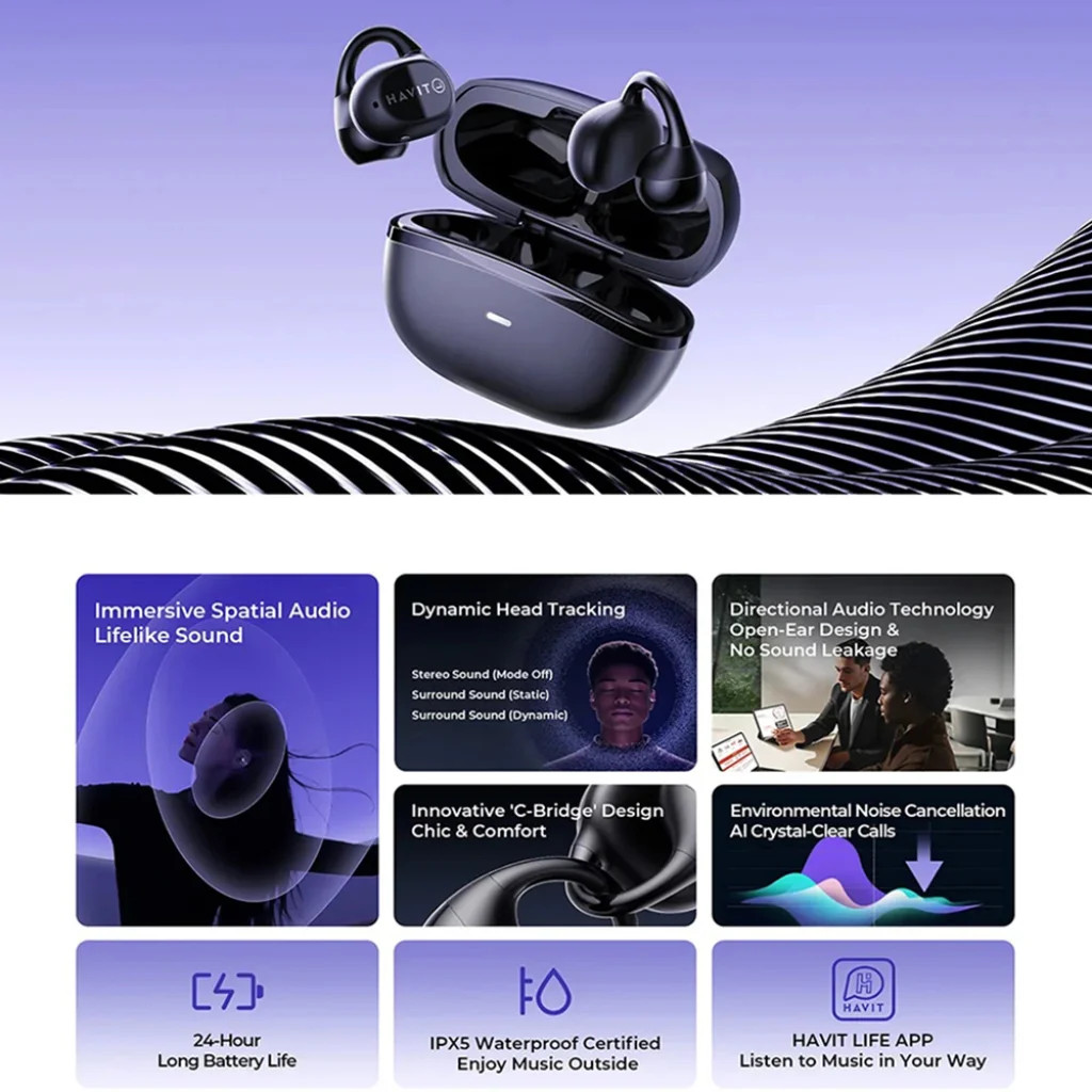 Havit vezeték nélküli fülhallgató (OWS916) - Szürke Élvezze a szabadságot és a kivételes hangzást a Havit OWS916 vezeték nélküli fülhallgatóval, amely a legmodernebb technológiával és innovatív designnal párosul. Ez a szürke színű, nyitott fülű kialakítású fülhallgató tökéletes választás azoknak, akik a kényelmet, a térbeli hangzást és a kristálytiszta kommunikációt keresik, miközben folyamatosan kapcsolatban maradnak környezetükkel. Térbeli hangzás és dinamikus fejkövetés Merüljön el a 360 fokos, élethű hangzásban, amelyet a fejlett térbeli audió technológia biztosít. Minden hang, ritmus és árnyalat úgy bontakozik ki, mint egy filmes mestermű, közvetlenül a zene vagy a tartalom szívébe vonzva Önt. A 3D hangzásélmény a hangokat különböző irányokból, elölről, hátulról, balról, jobbról és felülről szimulálja, páratlanul magával ragadó és dinamikus hallgatási élményt nyújtva. A dinamikus fejkövetés funkció valósághű hangzást biztosít, különösen videóbeszélgetések vagy játék közben. A hang pozíciója követi minden apró fejmozdulatát, így minden beszélgetés természetesnek és személyesnek érződik. Innovatív nyitott fülű design és kényelem A Havit OWS916 egyedülálló 'C-Bridge' kialakítása elegáns és modern megjelenést kölcsönöz, mint egy kifinomult ékszer a fülén. A nyitott fülű design és a direkcionális audió technológia garantálja, hogy a hang Ön felé irányul, elkerülve a hangszivárgást, miközben továbbra is hallja környezetét. Ez ideális választás kültéri tevékenységekhez, hiszen biztonságosan sportolhat vagy sétálhat anélkül, hogy elszigetelődne a világtól. Mindössze 5 grammos súlyával a fülhallgató szinte súlytalan, és innovatív, nyitott fülű kialakításának köszönhetően nem gyakorol nyomást a hallójáratra, így egész nap páratlan kényelmet biztosít. Az ergonomikus kialakítás tökéletesen illeszkedik a fül vonalaihoz, stabil és biztos tartást nyújtva még hosszú viselés esetén is. Kristálytiszta hívások és zajszűrés A beépített 2 mikrofon és az Environmental Noise Cancellation (ENC) technológia, mesterséges intelligencia támogatásával, kristálytiszta hívásokat garantál. Függetlenül attól, hogy zajos környezetben tartózkodik, hangja mindig élesen és tisztán hallható lesz a vonal másik végén, minimalizálva a környezeti zavaró tényezőket. Hosszú üzemidő, korlátok nélkül A Havit OWS916 fülhallgatóval a zene mindig Önnel marad. Egyetlen feltöltéssel akár 5.5 óra (60%-os hangerőn) zenehallgatási időt biztosítanak a fülhallgatók, a stílusos töltőtokkal együtt pedig ez az idő összesen 24 órára növelhető. Az USB-C porton keresztül történő gyorstöltésnek köszönhetően a fülhallgatók 1 óra alatt, a tok pedig mindössze 2.5 óra alatt teljesen feltölthető. Fülhallgató akkumulátor: 40 mAh Töltőtok akkumulátor: 400 mAh HAVIT LIFE alkalmazás: Személyre szabott élmény A HAVIT LIFE alkalmazással a hangzást teljesen testre szabhatja. Hozzon létre egyedi hallgatási élményt az alkalmazásban található EQ beállításokkal (6 hanghatás és egyedi opciók), személyre szabott érintésvezérléssel és alacsony késleltetésű játékmód be/ki kapcsolási lehetőséggel. Irányítsa a zenét és a hívásokat pontosan úgy, ahogy Ön szeretné. Tartósság és specifikációk Az OWS916 fülhallgatók tartós anyagokból készültek. A belső 'C-Bridge' kar 0.7 mm-es memória acélmaggal rendelkezik a megbízhatóság érdekében, míg a külső borítás bőrbarát anyagokból készült a kényelmes és stabil illeszkedésért. Az IPX5 tanúsítvánnyal ellátott vízállóság lehetővé teszi, hogy gondtalanul élvezze a zenét a szabadban, ellenállva az esőnek és az izzadságnak. Részletes specifikációk: Modell: Havit OWS916 Szín: Szürke Bluetooth verzió: 5.4 Hangszóró mérete: Ø12mm*2 Frekvencia tartomány: 20Hz-20kHz Vezeték nélküli hatótávolság: 10m (akadálymentes környezetben) Akkumulátor (fülhallgató): 40 mAh Akkumulátor (töltőtok): 400 mAh Lejátszási idő (fülhallgató): 5.5 óra (60%-os hangerőn) Lejátszási idő (töltőtokkal): 24 óra (60%-os hangerőn) Töltési idő (fülhallgató): 1 óra Töltési idő (töltőtok): 2.5 óra Töltő port: USB-C Vízállóság: IPX5 Funkciók: ENC, 2 mikrofon, Térbeli hangzás, Dinamikus fejkövetés, Havit Life App támogatás, Alacsony késleltetésű játékmód Fülhallgató mérete: 27.8*21.6*15.2mm Töltőtok mérete: 68*55*30mm Fülhallgató súlya: 5.0g (egyenként) Töltőtok súlya: 37.9g