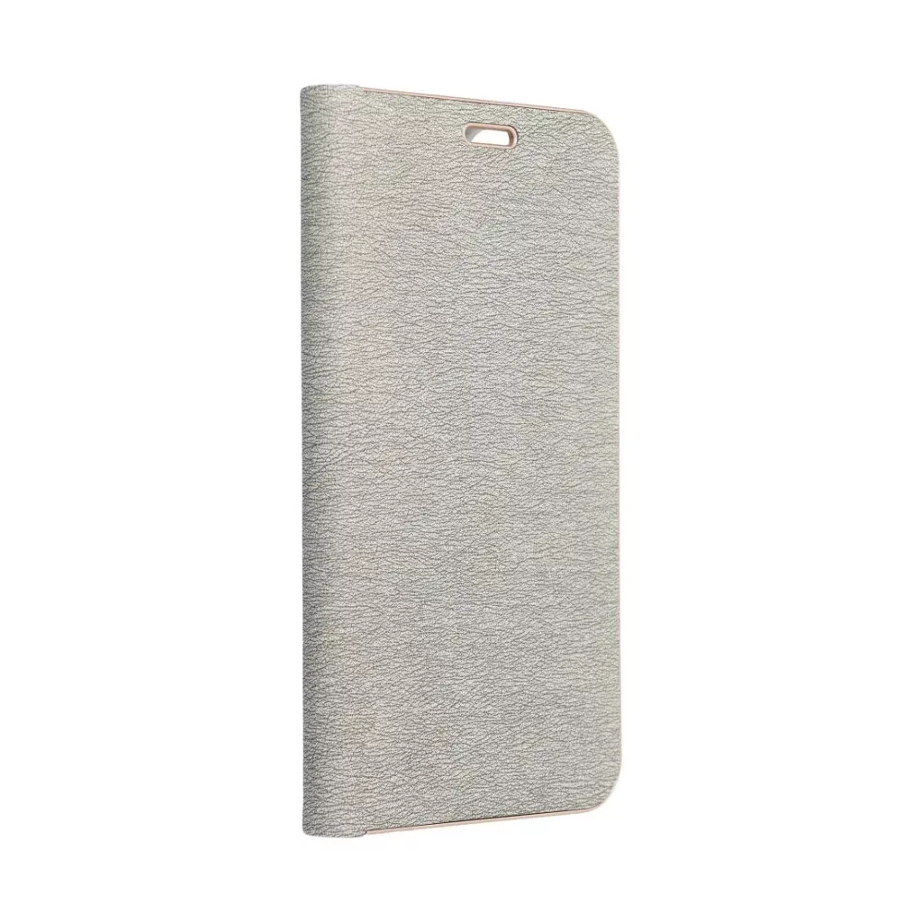Elegáns tok fémes kerettel a telefon fokozott védelme érdekében. Az vonzó textúra és a kellemes tapintású anyag stílusos tokot alkotnak, amely kiemeli a készülék modern dizájnját. Az belső oldalon és a tartórészben található puha velúrbélés megvédi a készüléket mindkét oldalról a sérülésektől és karcolásoktól. Az tartó rugalmas szilikonból készült és kivágásokkal rendelkezik. Az alumínium keret a széleken megerősíti a tokot és még jobban védi a készüléket. A fém és az eredeti anyag kombinációja egyedi és modern kompozíciót hoz létre, amely stílusossá és elegánssá varázsolja a készüléket. A tok egy kis zsebbel is rendelkezik a kényelmes dokumentumok vagy bankjegyek tárolására. A tok vízszintes alappal rendelkezik, amely alkalmas filmek vagy fotók nézéséhez. Az erős mágnes biztosítja a tok könnyű nyitását és zárását, valamint megakadályozza a véletlen kinyílást.