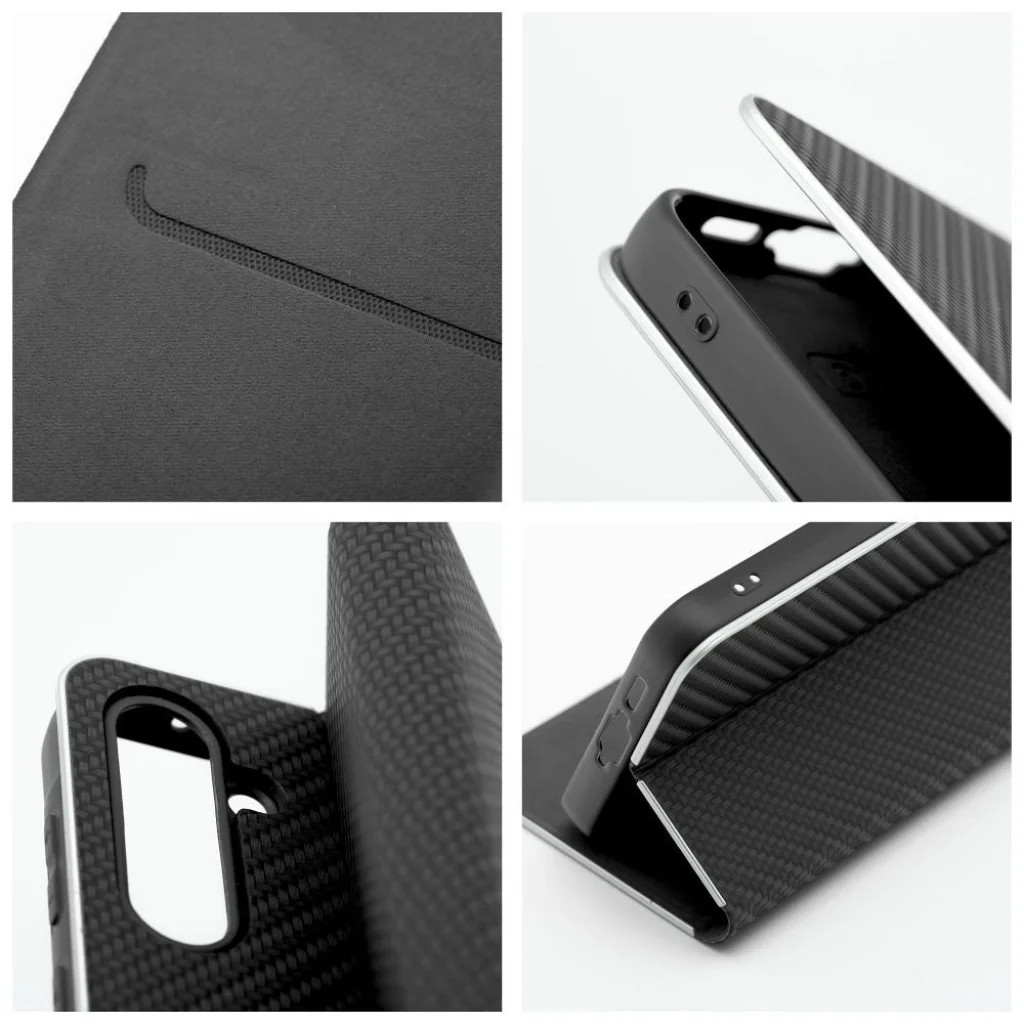 Elegáns tok fémes kerettel a telefon fokozott védelme érdekében. A vonzó textúra és a kellemes tapintású anyag stílusos tokot hoz létre, amely kihangsúlyozza a készülék modern dizájnját. A belső és a tartó részen lévő puha szarvasbőr anyag megvédi a készüléket mindkét oldaláról a sérülésektől és karcolásoktól. Az elasztikus szilikonból készült fogantyú kivágásokkal rendelkezik. Az alumínium keret a széleken még erősebbé teszi a tokot és még jobban védi a készüléket. A fém és az eredeti anyag ötvözése egyedi és modern kompozíciót hoz létre, amely stílusos és elegáns megjelenést biztosít a készüléknek. A tok egy kis zsebbel is rendelkezik a kézhez szükséges iratok vagy bankjegyek tárolásához. A tok vízszintes állványként is használható filmek vagy fotók nézéséhez. Egy erős mágnes biztosítja a könnyű zárását és nyitását, valamint megakadályozza a véletlen kinyílást.