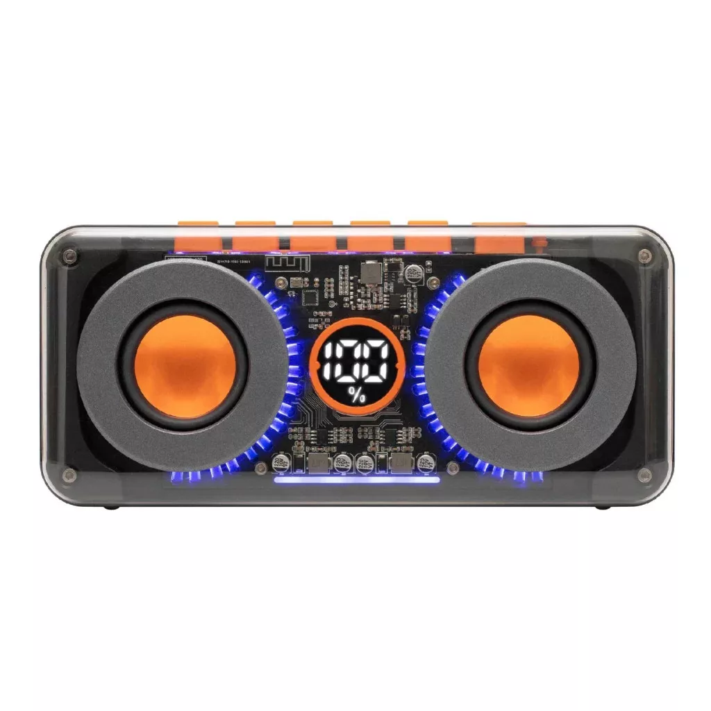 Egy olyan hangszórót keres, ami többre is képes, mint csupán zenelejátszásra? A SAL MECHAPOWER vezeték nélküli hangszóró és multimédia-lejátszó futurisztikus dizájnnal és átlátszó burkolattal nem csak hallható, de látványos kiegészítője is lesz otthonának vagy irodájának.Ez a készülék innovatív technológiát és stílusos kialakítást ötvöz. A változtatható RGB LED fényjátékának köszönhetően hangulatához igazíthatja a környezetét, míg a digitális hangerő-kijelző és az akkumulátor töltöttség kijelzése biztosítja, hogy mindig képben legyen a készülék állapotával. Két hangszóró sztereó párosítása lehetővé teszi a kiterjesztett stereo élményt, így akár egy nagyobb térben is tökéletes hangzást biztosít.Zenehallgatásra vágyik? Csak csatlakoztassa USB eszközét, és élvezze a tiszta hangzást, amit a beépített superbass mélysugárzó még inkább fokoz. A hangszóró beépített akkumulátorral rendelkezik, mely körülbelül 4 óra alatt töltődik fel és akár 8 órán át képes szolgáltatni a kiváló minőségű hangélményt.Fedezze fel a zenehallgatás új dimenzióit a SAL MECHAPOWER vezeték nélküli hangszóróval, mely nem csak erős teljesítményt, de vizuális élményt is kínál. Engedje, hogy otthona vagy munkahelye a modern technológia és dizájn találkozásának helyszínévé váljon!Beépített akkumulátor2 x 18650 (3.7 V / ~3000mAh)Csatlakoztatható memóriaFAT32, max.64 GBDigitális kijelzőakkumulátor töltöttség kijelzése (0-100%) • digitális hangerő-kijelzés (0-30)Frekvenciaátvitel60 - 20000 HzFunkciókvezeték nélküli BT TWS kapcsolat • zenelejátszás USB eszközrőlHangszóró2 x 50 mm + ovális passzív radiátor(mély)Jellemzőkfuturisztikus formatervezés, átlátszó burkolatKiemelt jellemződupla hangerő és kiterjesztett stereo élmény: két azonos hangszóró vezeték nélkül párosítható (BT TWS)Kimenőteljesítmény2 x 10 WLejátszható formátumokMP3/WMA/WAV/FLACMéret215 x 100 x 52 mmMűködési / töltési idő ~8 óra / ~4 óraOpcionális kiegészítőkjavasolt töltők: SA 24USB, SA 50USBSúly670 gSzínváltó LED hangulatvilágításvan (kikapcsolható)Sztereo térhatásvanTápellátásbeépített akkumulátorTartozékUSB-C töltőkábel Vezeték nélküli BT kapcsolat2.402-2.480GHz / v5.0 • <2.5mW / 10m max.