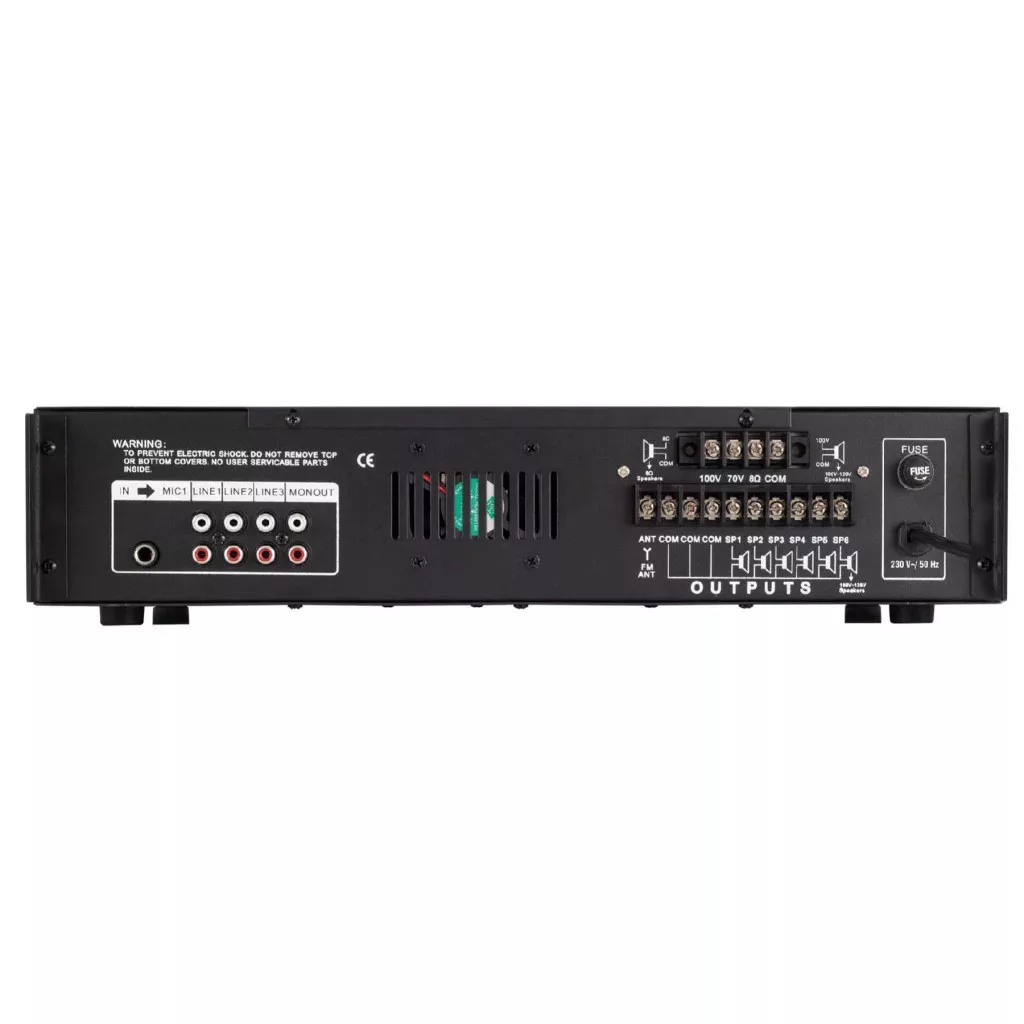 Egy keverő erősítő, amely minden zenei igényt kielégít, legyen szó professzionális rendezvényekről vagy otthoni felhasználásról? A SAL MPA 120BT multimédiás keverő erősítő 120 W teljesítménnyel és 6 csatornás keverési lehetőséggel rendelkezik, miközben számos modern funkcióval segíti a felhasználókat, mint például Bluetooth kapcsolódás, FM rádió és USB/SD lejátszás.Kiemelkedő teljesítmény és sokoldalú csatlakozási lehetőségekEz az eszköz 120 W-os kimeneti teljesítményt nyújt, amely elegendő ahhoz, hogy tiszta és erőteljes hangzást biztosítson kisebb és közepes méretű helyiségekben. A 6 független csatornának köszönhetően egyszerre több bemenetet is kezelhet, legyen szó USB-ről, SD kártyáról, mikrofonról vagy sztereó RCA bemenetről. A Bluetooth 2.1 kapcsolat akár 10 méteres hatótávval lehetővé teszi, hogy mobileszközéről vagy számítógépéről vezeték nélkül játsszon le zenét.Beépített multimédiás funkciókA SAL MPA 120BT integrált FM rádióval rendelkezik, amely memorizálható állomásokkal könnyíti meg a használatot. Az USB és SD bemenetek révén MP3 és WMA formátumú zeneszámokat is lejátszhat, akár ismétlés, akár véletlenszerű sorrendben. Az LCD kijelző egy grafikus rádióskálát, kivezérlésmérőt és lejátszási listát is megjelenít, hogy mindig pontosan kövesse, mi történik.Professzionális keverési lehetőségekA keverő erősítő magas és mély hangszínszabályozással rendelkezik, amely lehetővé teszi a hang pontos finomhangolását. A hangbemondások során automatikus zene le- és felkeverési funkció biztosítja a zökkenőmentes átmenetet, míg a kettős hangerő-szabályozás szintkorlátozással maximális kontrollt nyújt. Emellett gong hangjelzés funkcióval is ellátott, amely figyelemfelkeltő effektusként szolgálhat.Kiváló kompatibilitás és megbízhatóságA 100 V-os hangszórókhoz 6 független csoportba köthető és szabályozható csatlakozásokat kínál. A kimeneti lehetőségek között RCA (mono) kimenet is szerepel, amely további erősítők vagy hangrögzítők csatlakoztatását teszi lehetővé. A 230 V-os tápellátás és a masszív, 6,8 kg-os kivitel hosszú távú megbízhatóságot garantál.Válassza a SAL MPA 120BT multimédiás keverő erősítőt, hogy minden zenei és hangosítási igényét egyszerűen és hatékonyan megoldja – professzionális teljesítmény és modern funkciók egyetlen eszközben!Audio bemenet3 x sztereo (2xRCA) Audio kimenet2 x RCA (mono)Automatikus mikrofonkeverésvanGong hangeffektusvanHangerőszabályozóvanHangszórókimenetek4 - 8 OhmKeverőerősítő5 + 1 csatornásKimenőteljesítmény120 WMagas és mély hangszínszabályozóvanMéret480 x 98 x 355 mm / 6,8 kgMikrofonbemenet2 x Ø6,3 mmTápellátás230 V~ / 50 HzVezeték nélküli BT kapcsolatv2.1 + EDR / max.10 m • Bluetooth 2.402-2.480 GHz ERP ≤2.5 mW