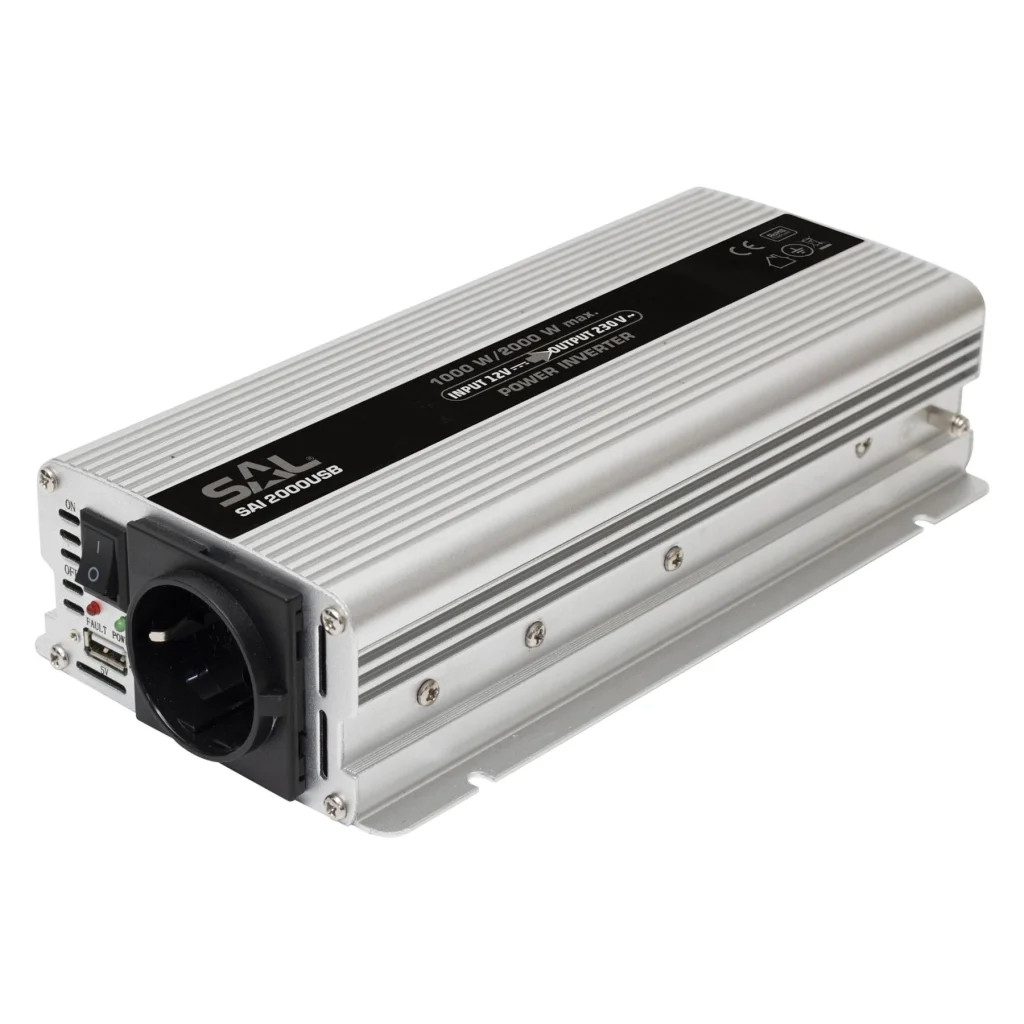 A SAI 2000USB feszültségátalakító hálózati feszültséget állít elő, ha rendelkezésére áll 12 V. Előnye, hogy alkalmazható járműben, hajón, kempingben. Kb.1000 W folyamatos terhelhetőség, illetve 2000 W csúcsterhelhetőség jellemzi. A készüléken USB töltőaljzat is található. A hálózati aljzat gyermekzárral van ellátva. Válassza a minőségi termékeket és rendeljen webáruházunkból!Akkumulátor kimerülése elleni védelemvanBemeneti csatlakozócsavaros csatlakozásBemenőfeszültség12 V DCBurkolat alapanyagafémGyermekzár a hálózati aljzatbanvanKimeneti csatlakozóhálózati aljzatKimenőfeszültség230 V~ / 50 Hz (módosított szinusz)Méret220 x 55 x 90 mmRövidzárlat elleni védelemvanSúly1 kgTartozékokszerelt csipeszes kábel (kb. 0,5 m)Terhelhetőség csúcs / folyamatoskb.2000 W / 1000 WTúlmelegedés elleni védelemvanTúlterhelés elleni védelemvanUSB kimenet5 V DC / max. 500 mA