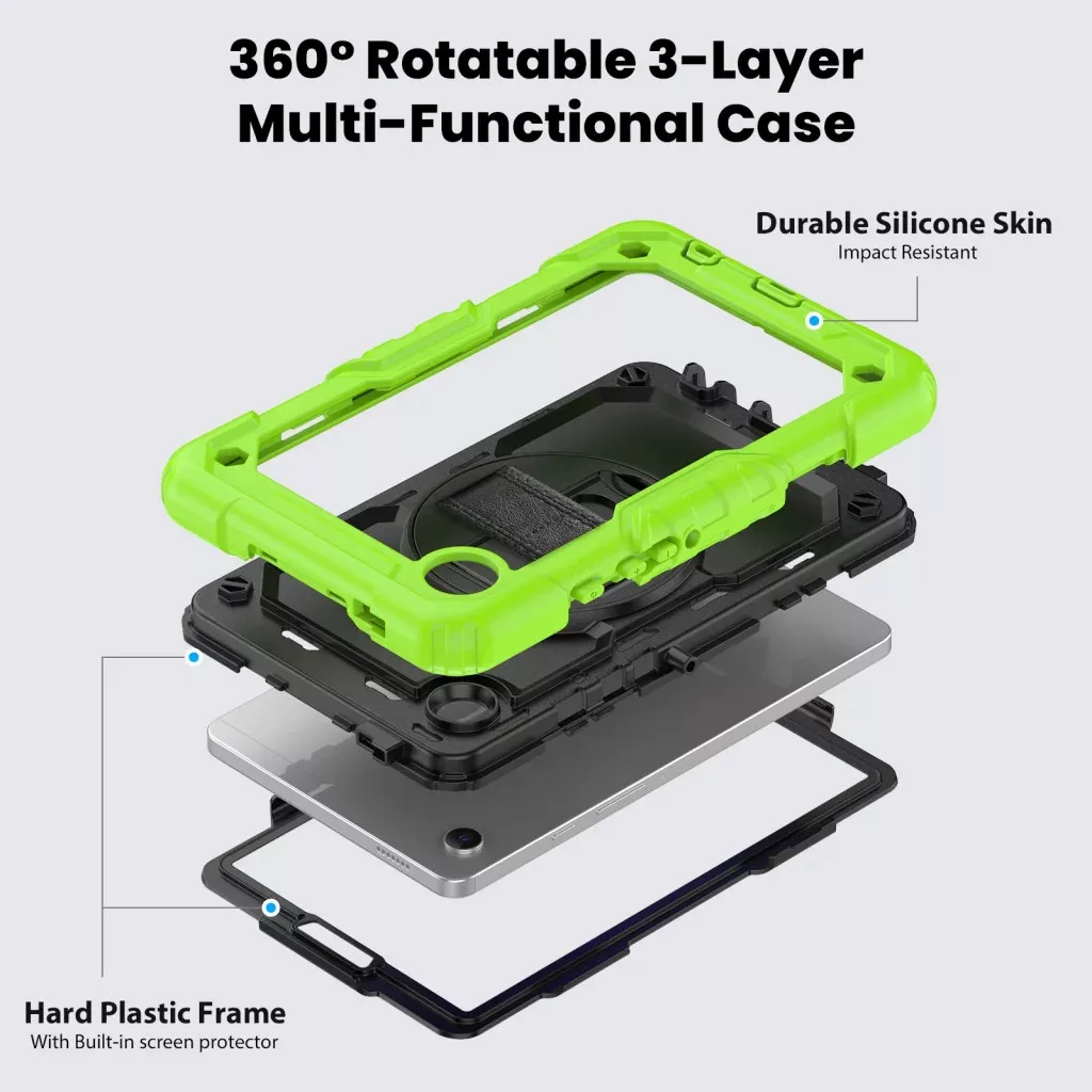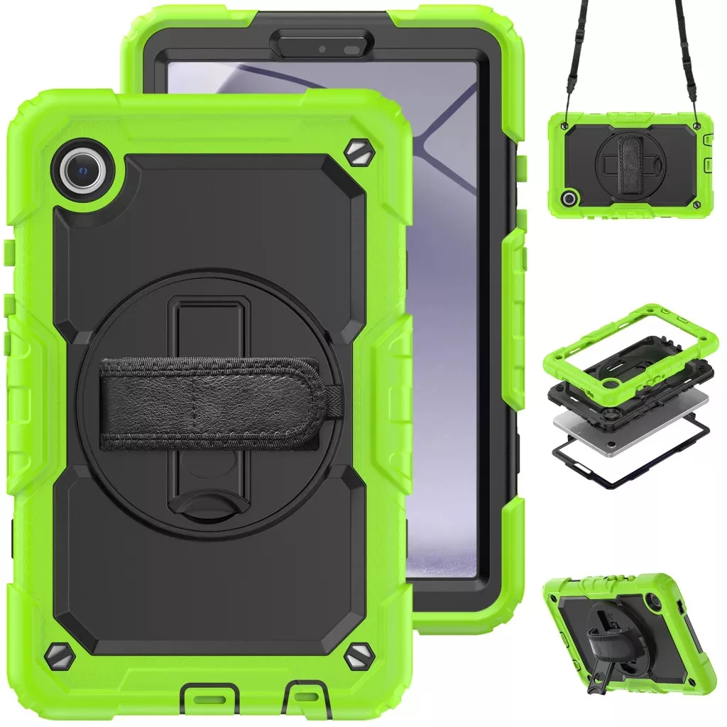 Fokozott védelem Samsung Galaxy Tab A9 Plus készülékének Védje meg Samsung Galaxy Tab A9 Plus (X210/X215/X216) készülékét a mindennapi kihívásokkal szemben ezzel a robusztus, sárga-zöld/fekete színű PC tablet tokkal, amely ütésálló kialakításával és praktikus vállpántjával tökéletes választás. Ez a tok nem csupán védelmet nyújt, hanem kényelmes és sokoldalú használatot biztosít minden helyzetben, otthon, munkahelyen vagy útközben egyaránt. Innovatív, 3 rétegű ütésálló kialakítás Végső védelem: Ez a tok gondoskodik a tableted teljes körű védelméről. A "Drop Proof" kialakításnak köszönhetően kiemelkedő ütésállóságot biztosít, hatékonyan védve a készüléket a leesés, karcolások, szennyeződések és a mindennapi használat során fellépő kopás ellen. Tartós szilikon külső: Az ütéscsillapító, strapabíró szilikon "bőr" elnyeli az ütéseket és rázkódásokat, maximalizálva a védelmet. Kemény műanyag keret beépített képernyővédővel: A belső kemény műanyag keret stabilan tartja a tabletet, és egy beépített képernyővédővel extra réteget biztosít a kijelző védelmére a karcolások és ütések ellen. Három rétegű multifunkcionális kialakítás: A gondosan megtervezett rétegek maximális biztonságot és hosszú élettartamot garantálnak készülékének. Sokoldalú funkcionalitás a mindennapokban 360°-ban forgatható kitámasztó: Az integrált kitámasztó lehetővé teszi a tablet kényelmes pozícionálását bármilyen irányba. Élvezze a filmnézést, olvasást vagy videóhívásokat 60°, 45° vagy 30°-os dőlésszögben – mindig megtalálja a tökéletes látószöget. 360°-ban forgatható, állítható kézi pánt: A hátoldalon található kényelmes, állítható kézi pánt biztonságos fogást biztosít egykezes használat során, csökkentve a véletlen leejtés kockázatát. Beépített ceruzatartó: A praktikus ceruzatartó gondoskodik róla, hogy stylusod (ceruzád) mindig kéznél legyen. Kényelmes használat és hordozhatóság Állítható és levehető vállpánt: A mellékelt vállpánttal kényelmesen hordozhatja tabletjét, így a kezei szabadon maradnak más tevékenységekhez. Ideális utazáshoz, munkához vagy szabadtéri kalandokhoz. Egyszerű és kényelmes: A tok a maximális védelem ellenére is megőrzi a tablet viszonylagos könnyedségét, és egyszerűen hordozható. Teljes hozzáférhetőség és tartósság Pontos kivágások: Minden gomb és port könnyen hozzáférhető marad, így a tok használata közben sem kell kompromisszumot kötnie a funkcionalitás terén. A jelvétel is zavartalan marad. Hosszú élettartam: Kiváló minőségű anyagainak és masszív felépítésének köszönhetően a tok hosszú ideig megbízhatóan szolgálja készülékét.