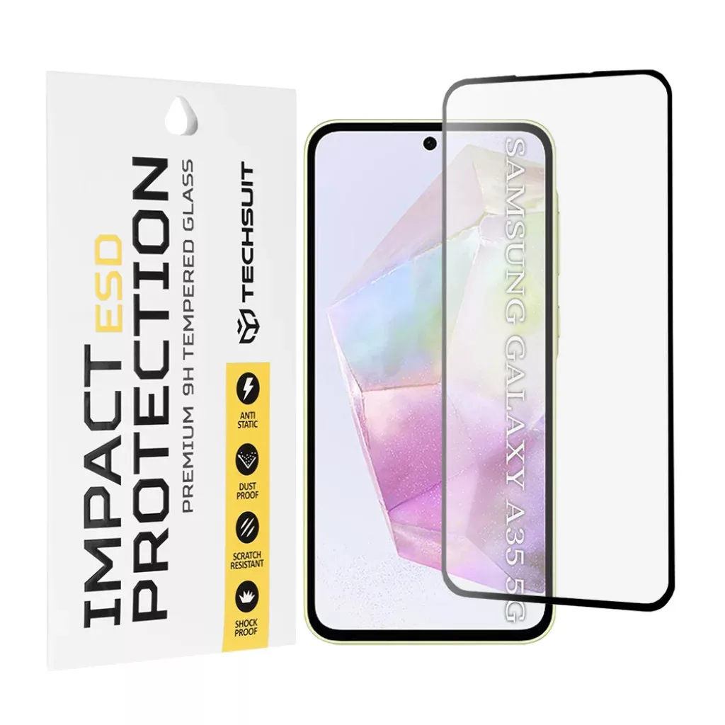 Techsuit fekete esd üvegfólia samsung galaxy a35 5g / a55 5g / m35-höz Védje Samsung Galaxy A35 5G, A55 5G vagy M35 készülékének kijelzőjét a Techsuit prémium ESD üvegfóliájával! Ez a kiváló minőségű, 9H edzett üvegből készült képernyővédő fólia a maximális ellenállást biztosítja a mindennapi igénybevételekkel szemben, miközben megőrzi a kijelző eredeti tisztaságát és érintésérzékenységét. Főbb jellemzők és előnyök: ESD (elektrosztatikus kisülés) védelem: Az innovatív ESD technológia, ahogy a csomagoláson is látható "IMPACT ESD PROTECTION" felirat jelzi, minimalizálja az elektrosztatikus feltöltődés okozta károkat, így gondoskodik készüléke elektronikai komponenseinek biztonságáról. Prémium 9H edzett üveg: Kiemelkedő karc- és ütésállóságot garantál. Hatékonyan védi a kijelzőt az éles tárgyaktól, a leejtésektől és a mindennapos kopástól, a képeken is látható ütéscsillapító és karcálló tulajdonságokkal. Por- és ütésálló kialakítás: A fólia megakadályozza a por és szennyeződések lerakódását a kijelzőn és az éleknél, emellett extra védelmet nyújt az ütődések és mechanikai sérülések ellen, ahogyan a csomagoláson jelzett "DUSTPROOF" és "SHOCK PROOF" ikonok is mutatják. Teljes kijelző lefedettség fekete kerettel: A precízen illeszkedő fekete szélű kialakítás tökéletesen integrálódik a telefon designjába, teljes körű védelmet nyújtva a kijelző teljes felületének, beleértve az éleket is, miközben esztétikus megjelenést biztosít. Kristálytiszta kép és érintésérzékenység: Az ultra-vékony és áttetsző anyag nem befolyásolja a kijelző fényerejét, színeit és az érintőképernyő érzékenységét, így Ön zavartalanul élvezheti telefonja funkcióit. Egyszerű, buborékmentes felhelyezés: A speciális kialakításnak köszönhetően könnyedén és buborékmentesen felhelyezhető. A Techsuit fekete ESD üvegfóliával készüléke kijelzője hosszú távon védett marad, megőrizve újszerű állapotát és funkcionalitását.