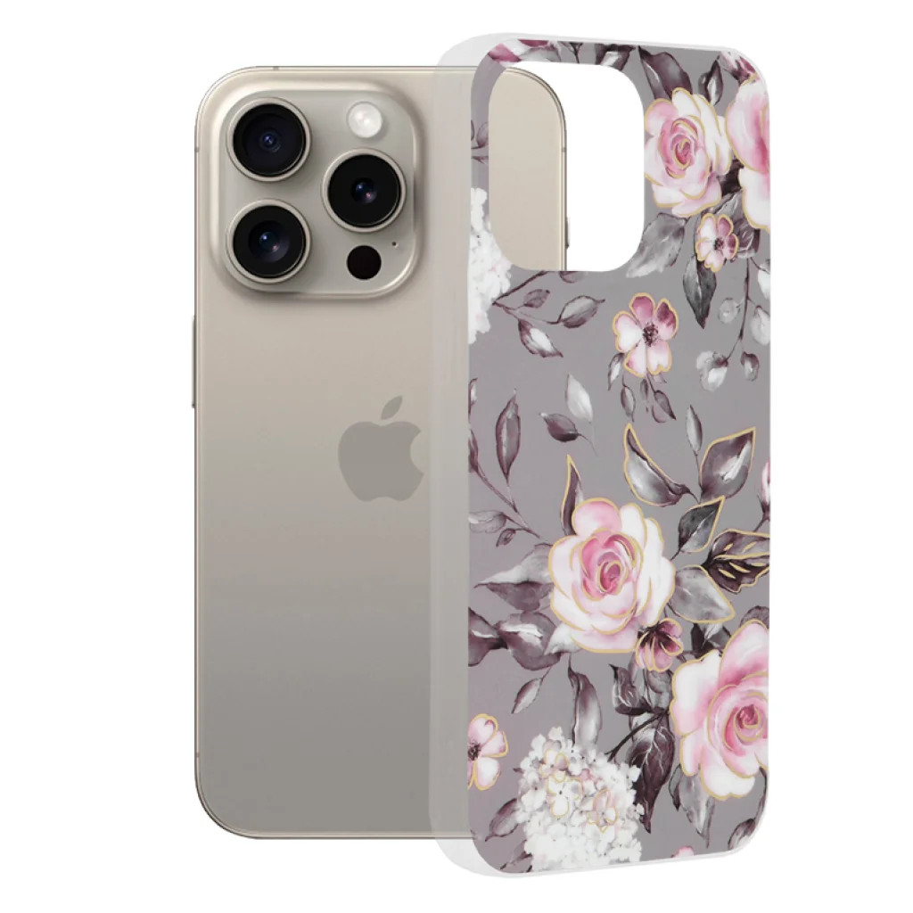 Techsuit - Márvány Sorozat - iPhone 15 Pro Max - Ruth Szürke Virágzása tok