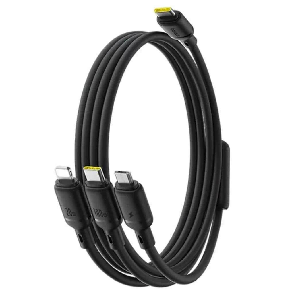 Baseus Silky 3in1 USB-C töltőkábel – Az Ön egyetlen töltési megoldása A Baseus Silky 3in1 USB-C töltőkábel a tökéletes megoldás mindazok számára, akik egyetlen, megbízható kábellel szeretnék tölteni különféle eszközeiket. Ez a 100W-os, 5A-es kábel nem csupán gyors és hatékony, hanem kivételesen tartós és rugalmas is, így ideális társ a mindennapokban és utazás során egyaránt. A fekete színű, 1.5 méteres hosszúságú Silky 3in1 modell a funkcionalitást és a stílust ötvözi. Három az egyben sokoldalúság Felejtse el a több kábel tárolásának és cipelésének problémáját! A Baseus Silky 3in1 kábel egyetlen USB-C bemenetről képes tölteni Lightning, microUSB és USB-C porttal rendelkező eszközeit is. Ez azt jelenti, hogy iPhone-ját, Android okostelefonját, táblagépét, power bankját vagy akár más USB-C kompatibilis eszközét is egyszerűen feltöltheti. A kábel különösen hasznos, ha több eszközzel rendelkezik, vagy ha egy családtagja más típusú telefont használ, hiszen egyszerre akár 3 eszköz töltésére is alkalmas. Villámgyors töltés és stabil teljesítmény Ez a Baseus kábel nem csupán sokoldalú, hanem rendkívül erőteljes is. Az akár 100W-os (az USB-C kimeneten) és 5A-es áramerősség biztosítja a villámgyors töltést, így minimálisra csökkenti az eszközök töltési idejét. A fejlett 6-szálas, megerősített ónozott magok stabil és megbízható áramellátást garantálnak még alacsony hőmérsékleten is, megóvva ezzel készülékeit és optimalizálva a töltési hatékonyságot. Prémium minőség és kivételes tartósság A Baseus Silky 3in1 kábelt a hosszú élettartamra tervezték. A gyártó által végzett több mint 10 000 hajlítási teszt bizonyítja ellenállását a mindennapi használat során fellépő igénybevétellel szemben. Puha TPE burkolat: A rugalmas és kopásálló TPE anyag garantálja a kábel ellenállását. Nem gubancolódik, és kellemes tapintású. Cinkötvözet csatlakozók: Az oxidáció- és rozsdamentes cinkötvözetből készült csatlakozók biztosítják a stabil és hosszú távú kapcsolatot, minimalizálva az érintkezési hibákat. Vastag, hajlításálló kábelmagok: A megerősített belső magok rendkívül ellenállóvá teszik a kábelt a hajlítással és töréssel szemben, hozzájárulva a "Built to Last" (tartósra tervezve) ígérethez. Kényelmes használat mindenhol Az 1.5 méteres hosszúság optimális szabadságot biztosít otthon, irodában vagy utazás közben. A puha TPE anyag nem csak tartós, hanem rugalmas és gubancmentes is, így a kábel könnyen tárolható és hordozható, anélkül, hogy összegabalyodna. A mellékelt tépőzáras kábelrendező segítségével mindig rendszerezetten tarthatja. Műszaki adatok Típus: Töltőkábel Modell: Baseus Silky 3in1 Csatlakozás: USB-C bemenet - Lightning / microUSB / USB-C kimenetek Kimeneti teljesítmény: Max. 100W (USB-C), max. 20W (Lightning) Áramerősség: Max. 5A Kábelhossz: 1.5 méter Szín: Fekete Anyag: TPE, cinkötvözet Kábelmag: 6-szálas, megerősített, ónozott