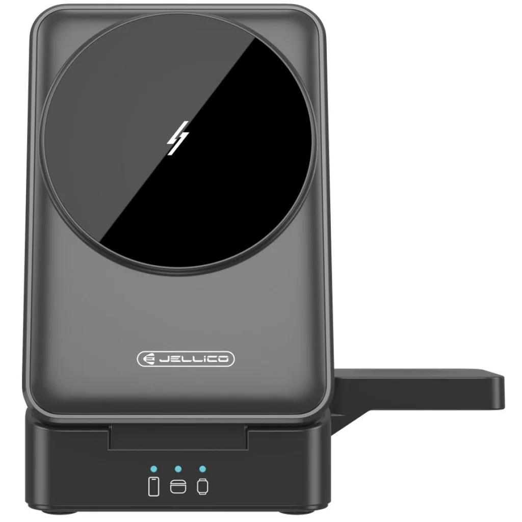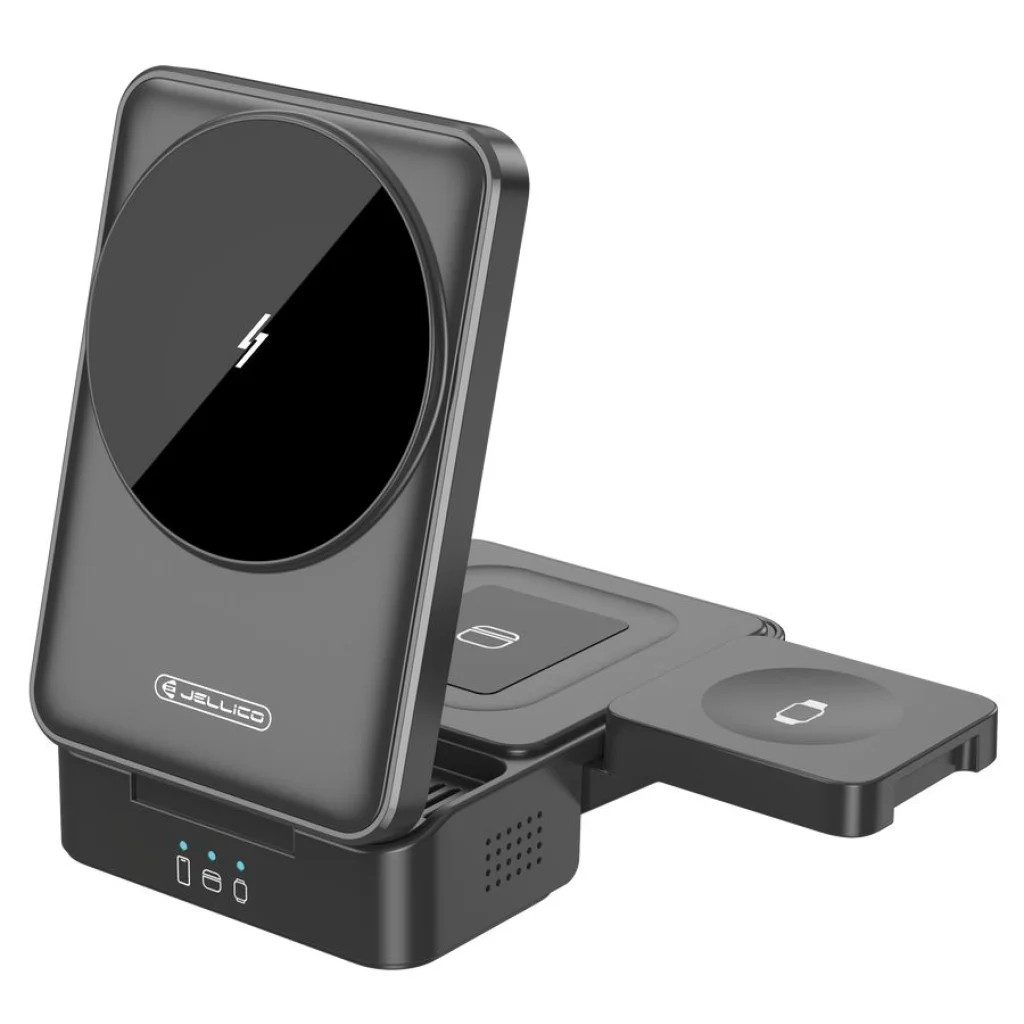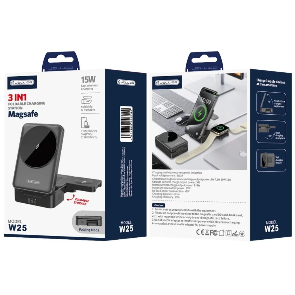 Vezeték nélküli töltő JELLICO 3 az 1-ben W25 15W fekete A JELLICO 3 az 1-ben W25 vezeték nélküli töltővel búcsút inthet a rendetlen kábeleknek, és élvezheti az Apple eszközei – iPhone (MagSafe kompatibilis), Apple Watch és vezeték nélküli fülhallgató – egyidejű, gyors és kényelmes töltését. Ez az elegáns és összecsukható töltőállomás tökéletes kiegészítője otthoni vagy irodai környezetének, miközben rendkívül hordozható kialakításának köszönhetően ideális útitárs is egyben. Főbb jellemzők 3 az 1-ben funkcionalitás: Töltsön egyszerre iPhone-t (MagSafe kompatibilis), Apple Watch-ot és vezeték nélküli fülhallgatót a kényelem jegyében. Gyors töltés: Akár 15W-os teljesítményt biztosít a telefonok számára, garantálva a gyors feltöltést. Összecsukható és hordozható kialakítás: A kompakt, összecsukható tárolási módnak köszönhetően könnyedén magával viheti bárhová, minimalista helyigénnyel. Elegáns design: Modern és letisztult megjelenése tökéletesen illeszkedik bármilyen otthoni vagy irodai környezetbe, esztétikailag is hozzájárulva a rendezettséghez. MagSafe kompatibilitás: Zökkenőmentes mágneses rögzítést és töltést biztosít az iPhone készülékek számára, egyszerű és stabil élményt nyújtva. Optimalizált töltési pozíciók: A telefon 70°-os, az okosóra pedig 130°-os szögben helyezhető el, ami kényelmes használatot tesz lehetővé töltés közben (pl. üzenetek ellenőrzése, óra megtekintése). Műszaki adatok Töltési mód: Elektromágneses indukció Bemenet: 9V/3A, 5V/3A, 12V/2.5A (optimális működéshez 9V-os adapter ajánlott) Telefon mágneses vezeték nélküli töltés kimeneti teljesítménye: 5W/7.5W/10W/15W Fülhallgató vezeték nélküli töltés kimeneti teljesítménye: 5W iWatch vezeték nélküli töltés kimeneti teljesítménye: 2.5W Maximális teljes kimeneti teljesítmény: 15W Terhelés nélküli energiafogyasztás: <1W Érzékelési távolság: 2-8 mm Töltési hatékonyság: 80% Fontos megjegyzések és óvintézkedések Ne tegye ki a készüléket túlzott nyomásnak vagy ütközésnek. Ne helyezzen mágnescsíkkal vagy chippel ellátott mágneskártyákat (pl. ID kártya, bankkártya) a töltőtekercs közelébe a kártyák meghibásodásának elkerülése érdekében. A stabil és megszakításmentes töltés érdekében javasoljuk 9V-os adapter használatát. Az 5V-os adapter elégtelen áramellátást okozhat, ami töltési megszakításokhoz vezethet.