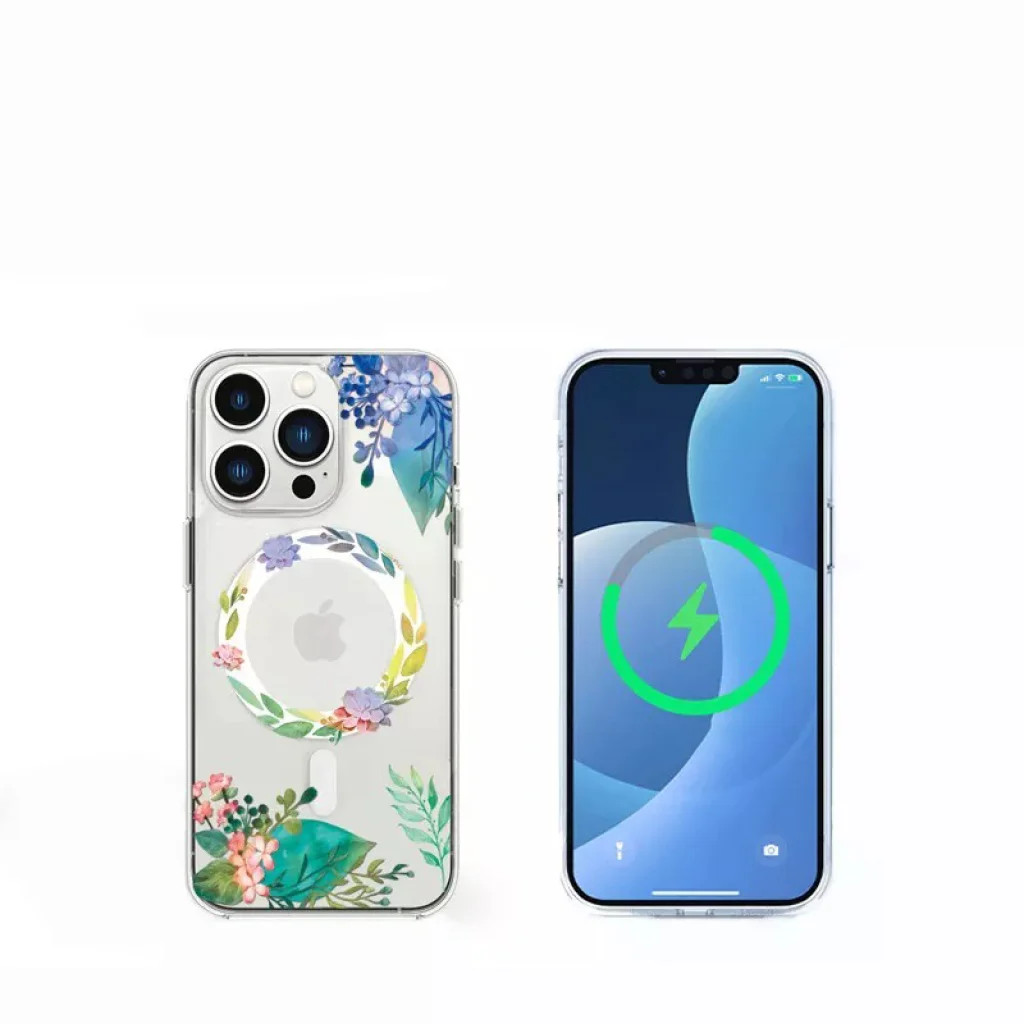 TPU+PC+Akril anyaghasználattal készült tok, amely védelmet nyújt a mindennapi használat során.A tok MagSafe-kompatibilis, így tokban is tölthető vezeték nélkül. A mágnesgyűrű biztosítja a maximális töltési hatékonyságot, valamint a MagSafe funkcióval rendelkező tartozékok gyors és egyszerű csatlakoztatását.Virág mintázattal ellátva