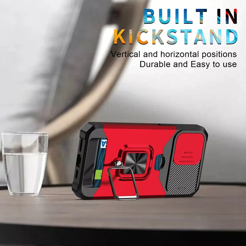 iPhone 14 Pro Max Ring Armor tok kameralencse védővel, kihajtható támasszal, kártyatartóval fekete Alphajack