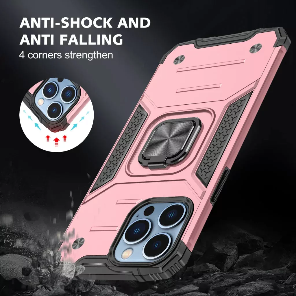 Rózsaarany ring armor tok iphone 14 pro max készülékre Védje iPhone 14 Pro Max készülékét a stílus és a funkcionalitás tökéletes ötvözetével! Az Alphajack Ring Armor tokot úgy terveztük, hogy maximális védelmet nyújtson, miközben kényelmes és sokoldalú használatot biztosít a mindennapokban, mindezt elegáns rózsaarany színben. Főbb jellemzők: Hibrid, többrétegű védelem: Ez a tok a kemény PC (polikarbonát) külső héj és a puha, rugalmas TPU (hőre lágyuló poliuretán) belső réteg kombinációjából épül fel, amely kiváló ütéselnyelést és karcolásállóságot biztosít. Ez a kemény PC és puha TPU kombinációja garantálja a tartósságot és a rugalmasságot. Megnövelt ütésállóság és sarktámogatás: A tok sarkai speciálisan megerősítettek ("4 corners strengthen"), így hatékonyan védik telefonját a véletlen leejtések és ütések ellen, biztosítva az "anti-shock és anti falling" védelmet. Kijelző és kamera védelem: A kijelző és a kamera körül is 0.3 mm-rel megemelt perem extra biztonságot nyújt, megakadályozva a közvetlen érintkezést sima felületekkel, így csökkentve a karcolások és sérülések kockázatát. Ez a "full camera protection" és "screen protection" garantálja, hogy értékes kijelzője és kamerája biztonságban legyen. Integrált, kihajtható ring állvány: A tok hátoldalán található, fémből készült, erős és tartós ring állvány kényelmes, szabadkezes médiafogyasztást tesz lehetővé ("Portable kickstand"). Nézzen videókat, böngésszen vagy videótelefonáljon könnyedén, bármikor. A gyűrű és az állvány egyben van, így egyszerűen felszabadíthatja kezét videónézéshez. Az "Aluminum stand" kialakítása erős és tartós, nem könnyen lazul meg. Forgatható design: Az állvány 180° vagy akár 360°-ban is elforgatható ("Ring stand rotating easily"), így bármilyen szögből optimális nézetet biztosít, valamint biztosabb fogást garantál használat közben. Mágneses autós tartó kompatibilitás: A ring állványba integrált, erős fémlemeznek köszönhetően ("Strong adsorption metal plate for the car holder") a tok tökéletesen tapad a mágneses autós telefontartókhoz, így telefonja biztonságosan rögzítve marad utazás közben is ("Car holder", "Fall down resistant"). Precíz illeszkedés és kivágások: A tok precízen illeszkedik az iPhone 14 Pro Max készülékhez, minden csatlakozó, gomb és a töltőnyílás szabadon hozzáférhető marad, anélkül, hogy le kellene vennie a tokot. Belső szennyeződés elleni védelem: A tok belső felületét úgy alakították ki, hogy hatékonyan gátolja a por és szennyeződések felhalmozódását, megőrizve telefonja tisztaságát és épségét. Válassza az Alphajack Ring Armor tokot, és élvezze az iPhone 14 Pro Max készüléke számára biztosított prémium védelmet és a mindennapi használatot megkönnyítő funkciókat, elegáns rózsaarany kivitelben!