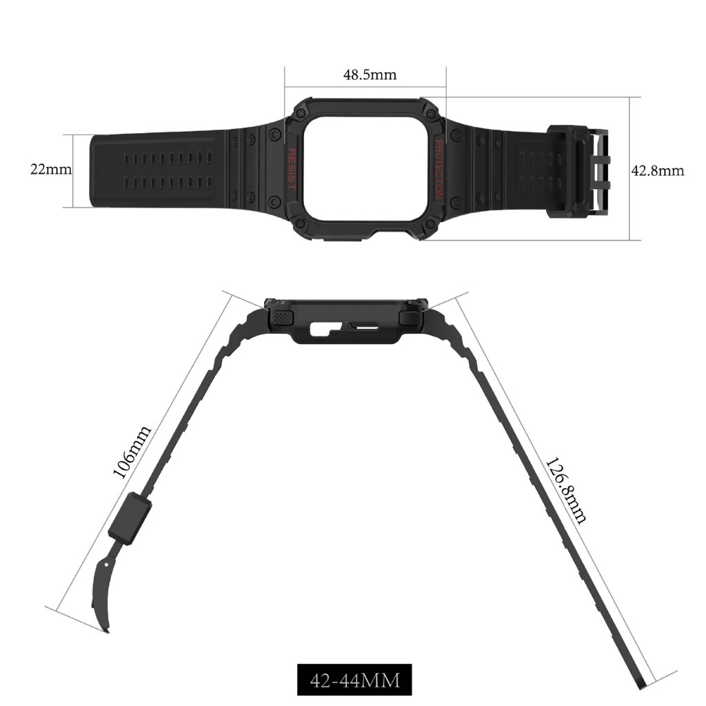 Fokozott védelmet biztosító tok és szíj. Tartós és rugalmas szilikon anyagból készült, amely ellenáll a kopásnak, kényelmes viselést biztosít. A tok nem korlátozza a hozzáférést a külső portokhoz, és hatékonyan védi a készüléket a karcolásoktól és leesésektől. Óraszíj és tok együtt, tökéletes védelmet nyújtó kombináció.Kompatibilis: Apple Watch 4/5/6/7/SE (42/44/45mm)