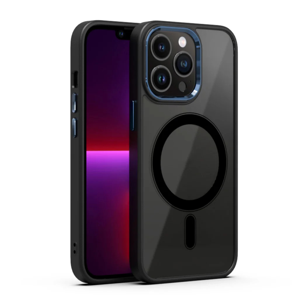 iPhone 14 Plus MagSafe-kompatibilis átlátszó tok fekete kerettel + kék kerettel a kamerák körül Alphajack
