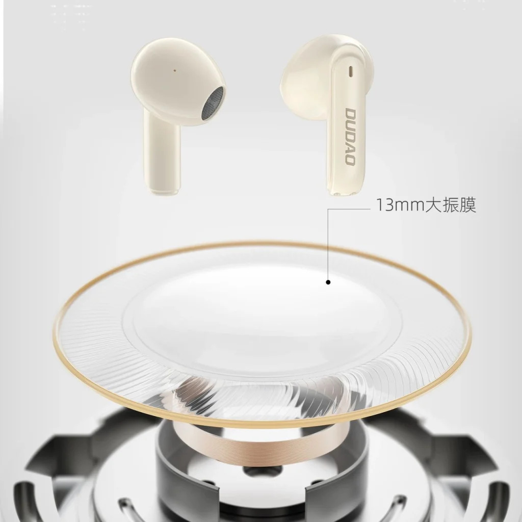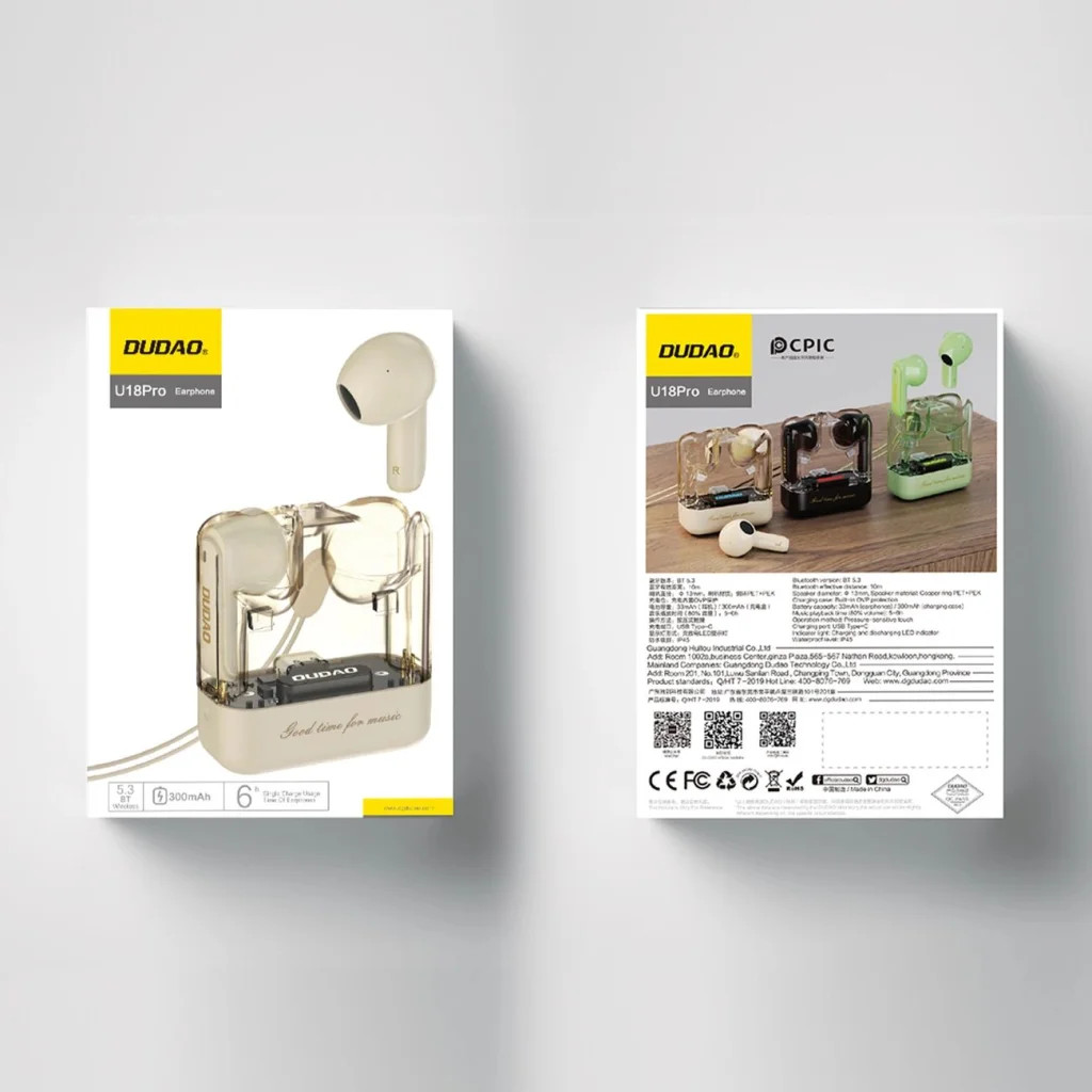 Dudao U18Pro Bluetooth 5.3 TWS vezeték nélküli fülhallgató - bézs Fedezze fel a kiváló hangzás új dimenzióját a Dudao U18Pro-val – Bluetooth fülhallgatókkal, amelyek egyedi dizájnukkal nyűgöznek le. Emellett a legújabb Bluetooth 5.3 technológia és a nagy kapacitású akkumulátor mobilissá és funkcionálissá teszi őket. Tudja meg, miért a Dudao U18Pro a tökéletes választás az igényes felhasználóknak. A Dudao U18Pro legfontosabb előnyei: - Kristálytiszta dizájn: A fülhallgatók átlátszó burkolata nemcsak modern, hanem bármilyen stílushoz is passzol. Ezek többek, mint egyszerű fülhallgatók – divatos kiegészítők a mindennapi megjelenéshez. - LED megvilágított logó: Nemcsak fülhallgatók – hanem figyelemfelkeltő kiegészítők is. A LED-del megvilágított logó egyedi karaktert kölcsönöz, kiemelve Önt a tömegből. - Elegáns prémium csomagolás: A Dudao U18Pro-val nemcsak kiváló fülhallgatókat kap, hanem elegáns csomagolást is, amely hangsúlyozza azok egyedi karakterét. Tökéletes ajándék önmaga vagy szerettei számára. Specifikáció: - Márka: Dudao - Modell: U18Pro - Bézs szín - Akkumulátor kapacitás: - fülhallgató: 33 mAh - tok: 300 mAh - Működési idő: akár 5 óra - Készenléti idő: akár 30 óra - Töltési idő: kb. 1,5 óra - Bluetooth verzió: 5.3 - Hatótáv: akár 10 m - Csatlakozó típusa: USB-C Kristálytiszta dizájn A Dudao U18Pro-val a legstílusosabb módon merülhet el a hangok világában. Az átlátszó dizájn nemcsak lenyűgözően néz ki, hanem lehetővé teszi a precizitás és az alkalmazott fejlett technológiák megtekintését. Ez nem csak egy audio eszköz – egy műalkotás is, amely vonzza a tekinteteket. Logó LED megvilágítással Emelkedjen ki a tömegből egy LED világítással ellátott logóval. Ez nemcsak elegáns részlet, hanem praktikus funkció is, amely információkat nyújt a fülhallgatók állapotáról. A stílus és a funkcionalitás itt kéz a kézben jár, így a Dudao U18Pro nemcsak egy fülhallgató, hanem az egyéni stílusának kifejezése is. Elegáns prémium csomagolás A Dudao U18Pro-val nemcsak kiváló fülhallgatókat kap, hanem elegáns csomagolást is, amely hangsúlyozza azok egyedi karakterét. Ez a tökéletes megoldás, ha magának vagy szeretteinek keres ajándékot. Nyissa ki a csomagot és érezze, hogyan vezet be a luxus és tökéletesség a tökéletes hangzás világába. Kényelmes és ergonomikus illeszkedés Akár útközben, akár edzés közben hallgat zenét, a Dudao U18Pro tökéletes illeszkedést biztosít. Ergonomikus kialakításuk kényelmessé teszi a viselést, és az átlátszó burkolat könnyedséget és stílust ad hozzá.