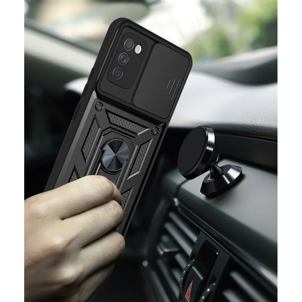 Rózsaszín Alphajack védőtok Samsung Galaxy A03s készülékhez Válassza a stílust és a maximális védelmet Samsung Galaxy A03s készülékéhez ezzel a prémium rózsaszín Alphajack tokkal. A hibrid anyaghasználat, az innovatív funkciók és a katonai szabványnak megfelelő ütésállóság garantálja, hogy telefonja biztonságban és elegáns maradjon minden körülmények között. Extrém védelem minden helyzetben Hibrid anyaghasználat: A tok gondosan válogatott TPU (termoplasztikus poliuretán) és PC (polikarbonát) anyagok kombinációjából készült, amelyek tökéletes egyensúlyt teremtenek a rugalmasság és a keménység között. A TPU rugalmassága elnyeli az ütéseket, míg a PC strapabíró pajzsként védi a készüléket, garantálva a hosszú élettartamot és a minőségi konstrukciót. Katonai szintű ütésállóság: A MIL STD 810G-516.6 szabványnak megfelelő „Drop Protection” és „Shock Resistant” minősítés garantálja, hogy telefonja ellenáll a mindennapi ütéseknek és eséseknek. A megerősített hátlap és az ütésálló lökhárító maximális biztonságot nyújt a készülék számára. Teljes körű ellenállás: Nem csupán az ütésektől véd! Ez a tok karcálló, hatékonyan megakadályozza az ujjlenyomatok és vízfoltok megjelenését a felületén, így telefonja mindig újszerűnek és tisztának tűnik. Belső felületi védelem: Innovatív kialakításának köszönhetően a tok belső felülete is védett a koszolódástól, tisztán tartva a telefon hátlapját. Innovatív kameralencse és magánélet védelem Elhúzható kameralencse védő: Egyedülálló, elhúzható csúszka védi Samsung Galaxy A03s készülékének érzékeny kameralencséit a karcolásoktól és az esetleges sérülésektől, meghosszabbítva azok élettartamát. Adatvédelem és tisztaság: A könnyen eltolható csúsztatható fedél nemcsak fizikai védelmet nyújt a kamerának, hanem a magánéletet is óvja, megakadályozva a nem kívánt rálátást. Emellett hatékonyan gátolja a por bejutását a lencsékhez, garantálva a tiszta és éles képeket. Funkcionális design és kényelem Beépített, forgatható gyűrűtámasz: A tokba integrált, masszív gyűrűtámasz nem csak egyedi megjelenést kölcsönöz, hanem rendkívül praktikus is. Segítségével kényelmesen nézhet videókat, böngészhet vagy videóhívást folytathat anélkül, hogy a telefonját a kezében kellene tartania. 360°-os forgatás és 110°-os dönthetőség: A gyűrű 360 fokban elforgatható, és 110 fokban dönthető, így bármilyen szögből optimális betekintési szöget biztosít, maximális rugalmasságot nyújtva. Mágneses autós tartó kompatibilitás: A gyűrűbe épített mágneses fémlemez lehetővé teszi a telefon egyszerű és biztonságos rögzítését a mágneses autós telefontartókra, így vezetés közben is kényelmesen használhatja a navigációt. Precíz illeszkedés: A tok tökéletesen illeszkedik a Samsung Galaxy A03s készülékhez, minden port és gomb könnyen hozzáférhető marad, anélkül, hogy a tokot el kellene távolítania. Kényelmes fogás: A speciális textúrájú felület és az ergonomikus kialakítás kiváló fogást biztosít, minimalizálva a véletlen leejtés kockázatát, miközben hozzájárul a jó felhasználói élményhez.